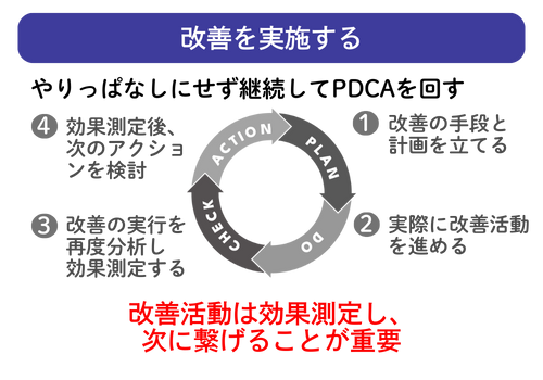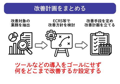 ルール見直し、役割分担、ツール導入、仕組み化・自動化などを実行します。